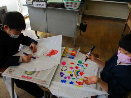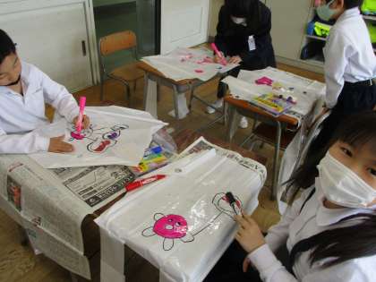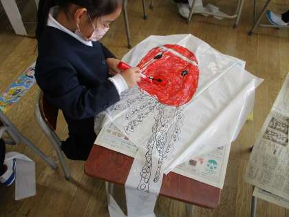 生活科の学習でたこあげをします。今回はたこに自分の好きな絵を描きました。明日、天気がよければ、たこあげをしようと考えています。自分のたこが空にあがるのが楽しみですね。