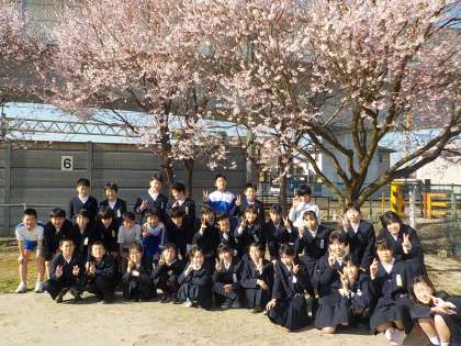 校庭の桜は、一昨日、一輪だけ咲いていたのですが、今朝は、たくさん咲いていましたので、思わず、朝のトレーニングの後、全体写真を撮りました。