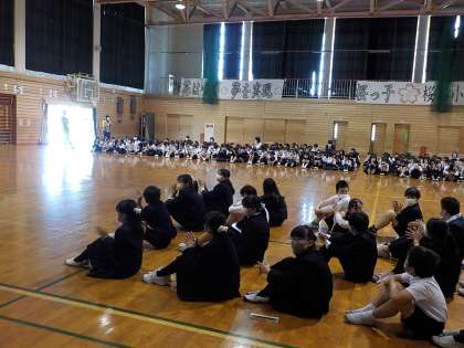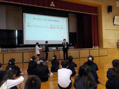 今日の桜っ子タイムは、全校児童が体育館に集まり、児童会発足式が行われました。各委員会から、めあてと活動計画についての発表がありました。その後、6年生から、今年度の児童会の目当てが提案され、全校児童の合意を得て、「進んでチャレンジ!最高な桜っ子」に決定しました。
