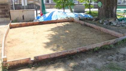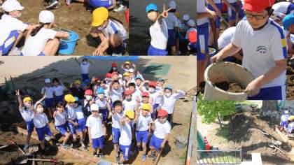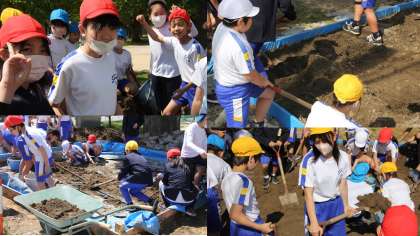 子供たちは、4m×4m×0.3mの木枠の中にあった約5tの土を2時間かけて運び出しました!