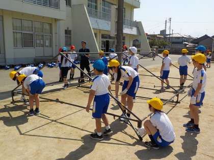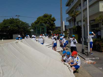 5年生の子供たちも、熱い中、一生懸命テントを組み立てました。