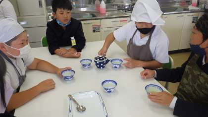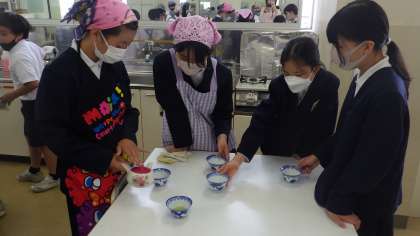 家庭科で、「玄米茶」を入れて飲みました。前回の実習では「緑茶」を入れましたが、苦すぎた班がありました。今回は、前回の反省点を生かしてお茶を入れました。どの班もよい色のお茶を入れ、よい香りを楽しみながら、和やかにお茶を味わっていました。
