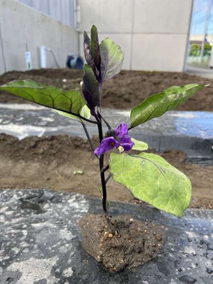 学校の畑に植えた「ナス」の苗には花が、ピーマンの苗には実ができました。