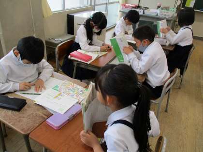 右の写真は、国語の時間の様子です。友達と一緒に進んで学習に取り組んでいます。