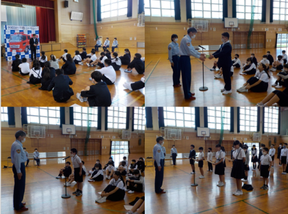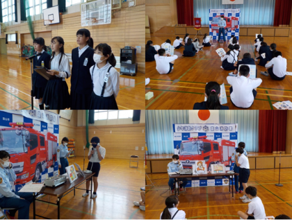 また、午前中、BFC(少年少女消防クラブ)のバッジ授与式を行いました。式に引き続き、防火防災教室を行い、119番への通報訓練等を行いました。