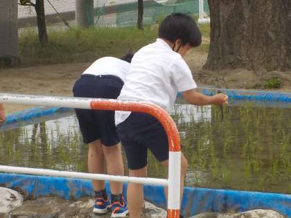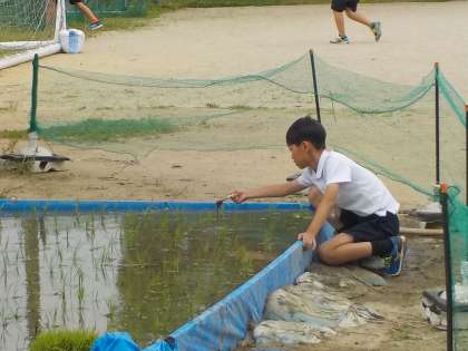 休み時間に、自主的に田んぼの世話をしている5年生の姿がありました。