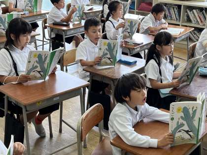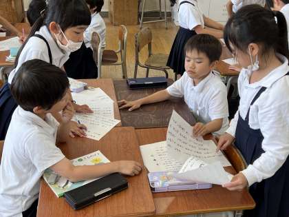 国語科「たんぽぽのちえ」の学習では、音読をした後、グループごとにバラバラになった文章を順序通りに並べる活動をしました。次の学習では、文章のどこに着目すると、正しく順序通りに並べられるのか話し合います。