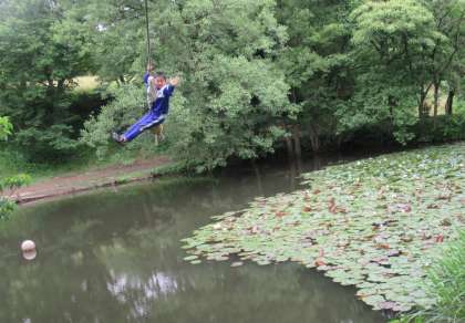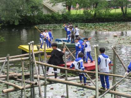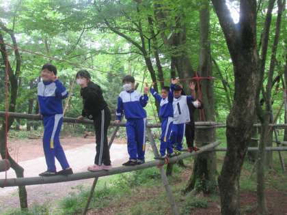 宿泊学習一日目の午後の活動は池遊びです。ターザンロープやいかだ遊び等で思い切り遊びました。