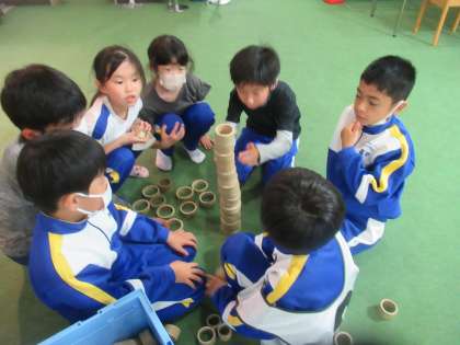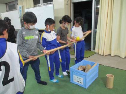 宿泊学習一日目の夕食後の活動はバンブーチャレンジです。竹で作られた様々なおもちゃを班の仲間と協力して楽しみました。