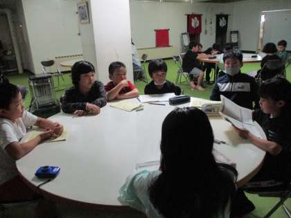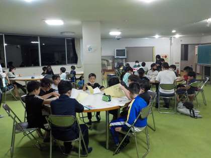 宿泊学習一日目のふり返りの様子です。係ごと、班ごとに一日を振り返り、明日の活動のがんばりたいこと等を話合いました。