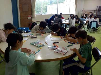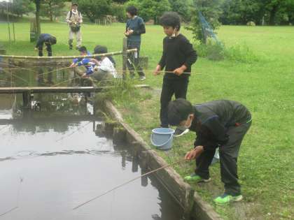 宿泊学習二日目の午後の活動は、ザリガニつりと木のキーホルダーづくりです。楽しみにしていたザリガニつりでは、集中してえさを見つめていました。木のキーホルダーづくりでは、思い出に残るオリジナルのキーホルダーをつくりました。