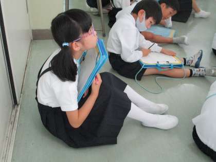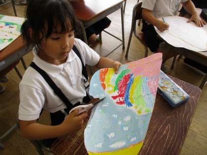 自分と友達の作品をじっくり見つめる時間をとりました。真剣な眼差しで鑑賞をしている子供たちです。鑑賞の後には、いよいよたまごを割りました。ドキドキワクワクしながら、はさみで丁寧に切っていました。