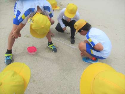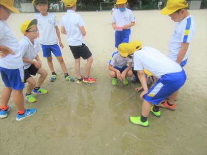 理科では雨水のゆくえと地面のようすについて学習しています。今日は雨水が高いところから低いところへ流れていること等を観察してたしかめました。体育科ではポートボールの学習をはじめ、試合で重要になるパスやドリブルを練習しました。