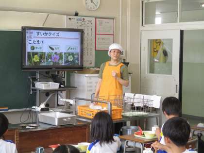 栄養教諭の藤樫先生から、スイカについてのお話とクイズを出していただきました。クイズでは、2年生が育てている野菜の花も出てきてとても盛り上がりました。今日の給食もとてもおいしかったですね。来週の給食も楽しみですね。