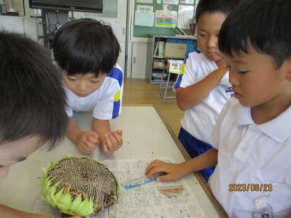 理科では、花から実への学習でひまわりの観察をしました。