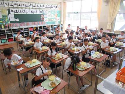 今日から始まった給食では、身支度をすばやくして、給食当番は上手に盛りつけをしました。エプロンやマスクなど、新学期の準備にご協力いただきありがとうございます。