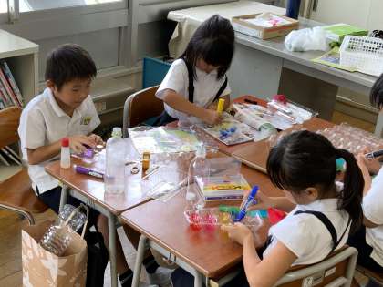 図画工作科「ひかりのプレゼント」の学習では、それぞれが考えて持ち寄った材料に手を加え、光を通して形や色を楽しみます。保護者の皆様、材料集めにご協力くださり、ありがとうございました。