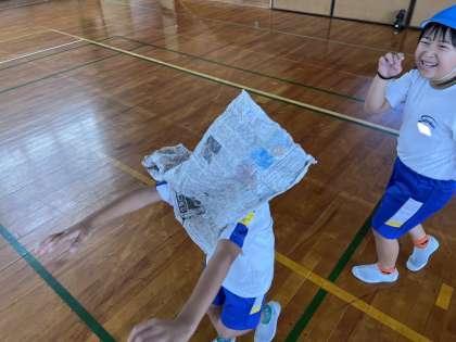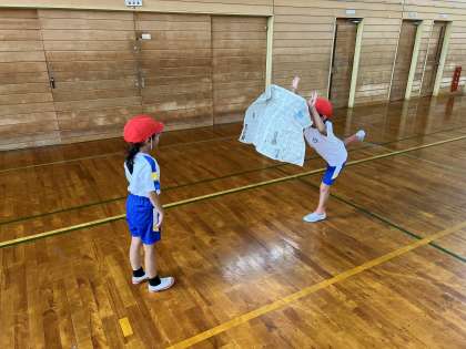 体育科の学習では、ペアが動かす新聞の動きの真似をする表現遊びに取り組んだり、体の一部を使って新聞をキャッチするゲームに挑戦したりしました。段々動きがダイナミックになり、自然と笑みが溢れる子供たちです。