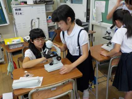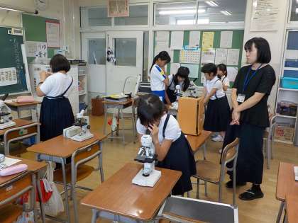 写真は、サイエンスクラブの活動の様子です。本来、理科室で活動するのですが、理科室には冷房設備がないので、6年1組の教室で活動しました。顕微鏡でいろいろなものを観察しました。普段は、数人で1台使う顕微鏡ですが、今日は一人でじっくり使えます。後半は、しっかりピントが合った状態にして、他の人の顕微鏡を観察して回りました。