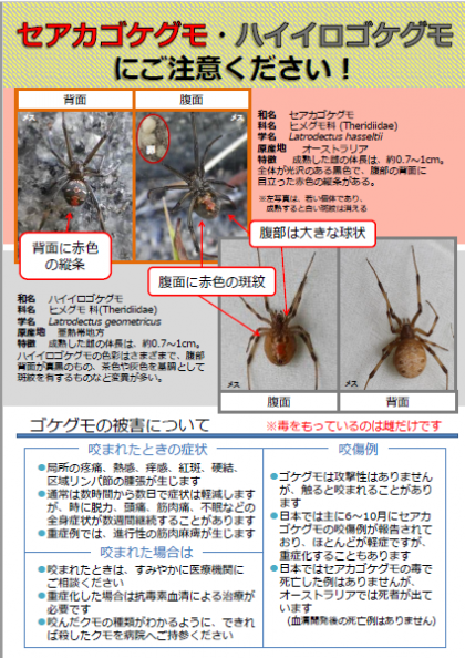 富山市内において神経毒を有する特定外来生物の「セアカゴケグモ」が発見されました。触るとかまれる場合があり、かまれた場合、重症化することがあります。子供たちには、登下校及び外出時にセアカゴケグモを発見した場合は、近寄ったり、素手で触ったりせず、周囲の大人に知らせるよう指導します。セアカゴケグモの見分け方、防除手法、かまれたときの対応等についてtetoruでの配付資料(下の写真)をご覧いただくとともに、ご家庭でも注意してください。
