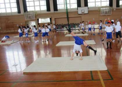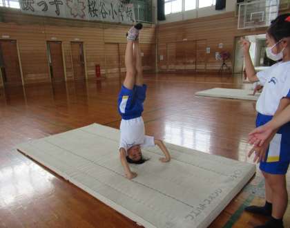 体育では、マット運動を続けています。前転や後転だけでなく、側方倒立回転や頭倒立にもチャレンジしています。時間いっぱい、やる気をもって取り組んでいる子供たちです。