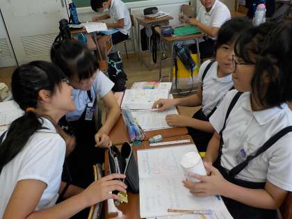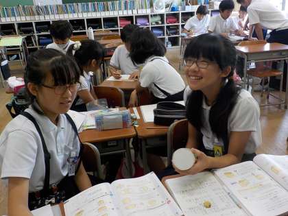 今日の算数の時間は、立体の体積の求め方を考えました。5年生で学習した、直方体、立方体の体積の求め方を基に、角柱や円柱の体積は「底面積×高さ」で求められることを見つけました。