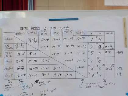 今日は、第2回ビーチバレーボール大会の最終戦でした。どのチームも声を掛け合いながら、練習やゲームに取り組んだ学習も、今日で修了。ふり返りを行い、次の学習に入ります。ただ、雨天の場合に、ビーチバレーボールを続けたいという声もあるので、今後検討したいと思います。