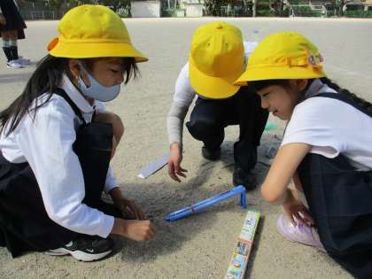 理科の時間には、棒温度計を使って、日なたと日かげの地面の温度を調べました。