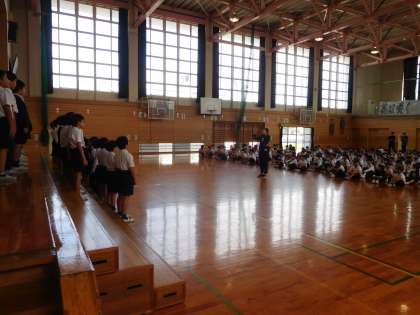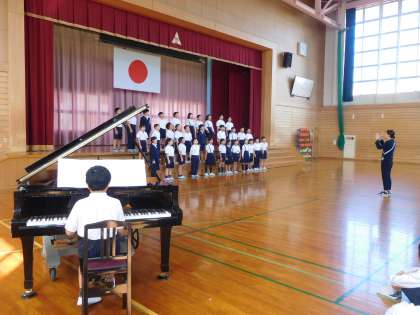 4年生が10月6日(金)に行われる連合音楽会で歌う歌(2曲)を全校児童に披露しました。