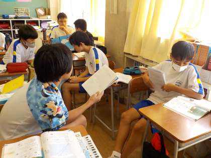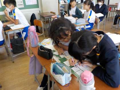 算数の時間、比例を活用した問題を解く学習を行いました。自分の考えをもち、ペアで説明し合う活動では、着眼点によって解き方がいろいろあることが分かり、考えが深まりました。比例の考え方は、生活の中にも多く使われていることを改めて知ったという感想もありました。