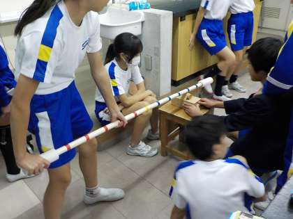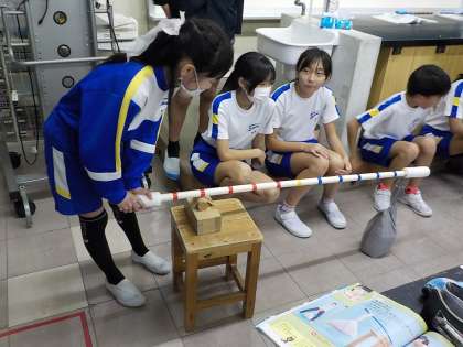 理科の学習、今日から「てこのはたらき」の学習が始まりました。今日は、棒と支えを使って、支点の位置や棒を持つ位置を変えることで、5kgのおもりの重さが違って感じることを体感しました。子供たちは「同じ5kgのおもりなのに、重さが全然違う」と、驚いていました。