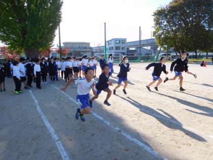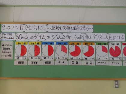 子供たちは「きのうの自分にチャレンジ 〜運動も笑顔も最高な桜っ子〜」のスローガンのもと、「50m走のタイムでちぢんだ桜っ子の割合を90%以上にする」を目差し、朝のトレーニングに取り組んでいます。