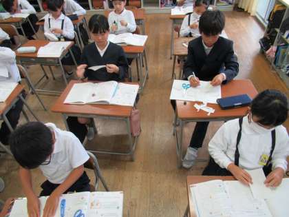 算数では、円の学習をしています。2組は、円の中に直線を書いたり、円を折り曲げたりして、いろいろな方法で円の中心を見付けようとしました。