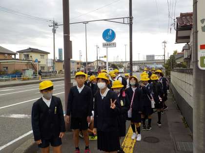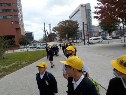 今日は、オーバードホールで「こころの劇場」が開催され、桜谷小学校は徒歩で参加しました。劇団四季のみなさんが、「エルコスの祈り」というミュージカルを上演してくださいました。会場の写真は不可なので、歩いている写真を載せます。