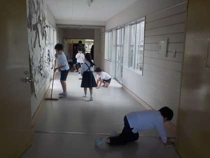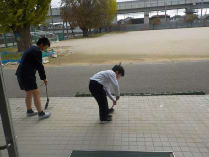 今日から、第3期の清掃がスタートしました。6年生は、新しい清掃場所で、新しい役割を担当する下級生に、清掃道具の使い方や、清掃の仕方を丁寧に教えていました。Tさんは、ほうき担当の子に使い方を教えた後、ぞうきん担当の子には、一緒にぞうきんがけをして、やり方を教えていました。Kさんも、1年生と一緒にほうきでそうじをしながら教えていました。頼りになる6年生です。