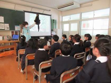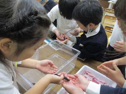 ファミリーパークから2名来校され、スライドでタヌキやムササビなどの呉羽丘陵に住む生き物について紹介してもらいました。後半は、カエルやホクリクサンショウウオなどを触ったり眺めたりして、身近な自然にいる生き物への興味を深めることができました。