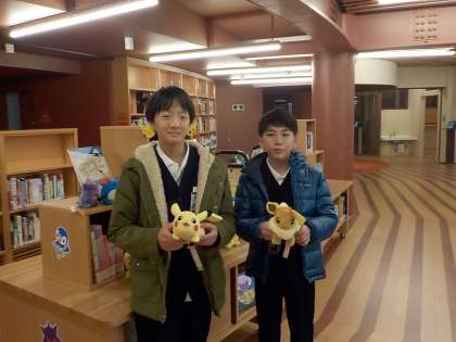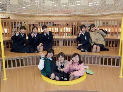 図書館内には、子ども用のエリアがありました。ちょっとお茶目な6年生です。