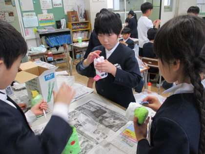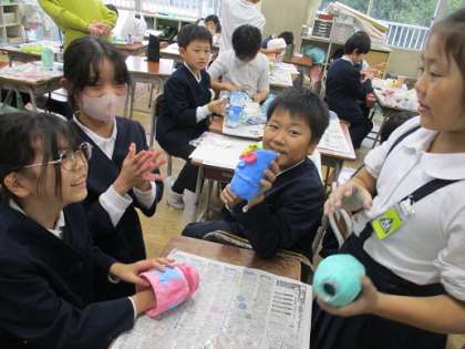 紙粘土と絵の具を使って、貯金箱や鉛筆立て、小物入れなどをつくりました。