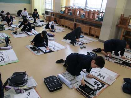 床に新聞紙を敷いて、「正しい心」の毛筆練習に真剣に取り組みました。