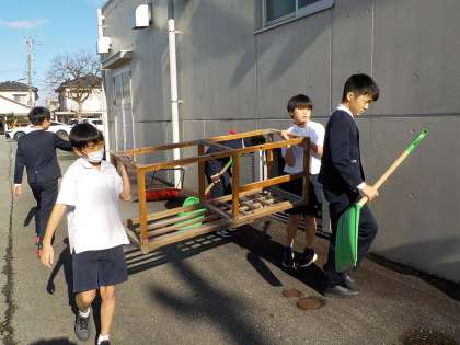 もうすぐ積雪があるかも知れないという気象情報を受け、学校でも除雪用具の準備をするのですが、今日は6年生がこの仕事をしました。児童玄関にスコップやスノーダンプを運びました。