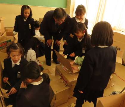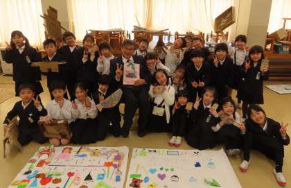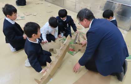 段ボールで作った物で校長先生と楽しみ、手紙や折り紙を贈って感謝の気持ちもしっかり伝えました。