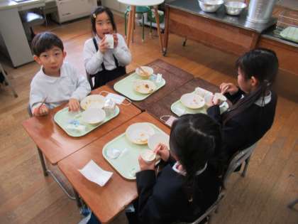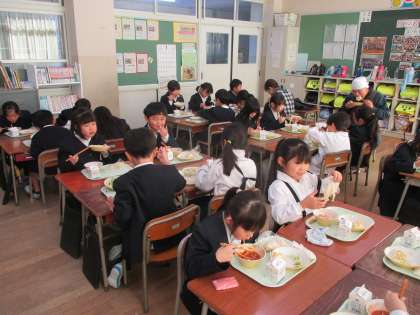 給食では、グループ会食が始まりました。