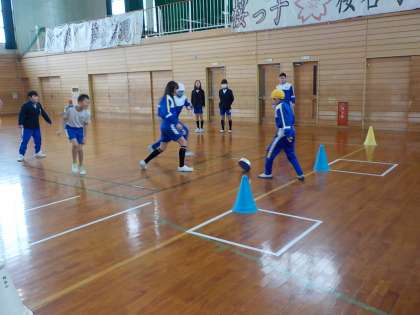 体育の時間、ゴール型のゲームとしてディスクを使ったサッカーに取り組んでいます。サッカーというより、フットサルに近いのですが、地面を這うディスクを使うので、あまり空中には上がらないのです。球技を苦手とする子も楽しめるようになっています。攻撃側が3人、守備側が2人として、点数が入りやすいルールにしています。今日は、ゲーム形式でもやってみました。
