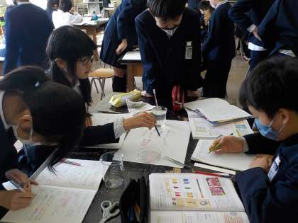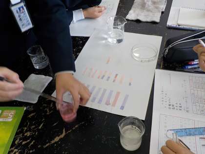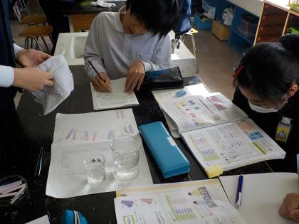 今日の理科の時間は、「水溶液を仲間分けしよう」という学習をしました。リトマス紙を使って、酸性、アルカリ性、中性に仲間分けします。前回の授業で使った水溶液に加えて、消毒液や石けん水も調べてみたいと、子供たちの興味は広がっていきました。