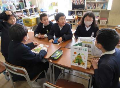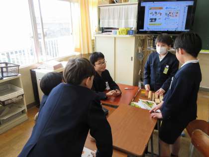 算数科では、最後の単元の学習を始めています。今回は、3つまで質問をして、友達が選んだ形がどれなのかを当てるゲームをしました。「面の形は全部同じですか」「面は全部でいくつですか」と、選んだ積み木を当てるためにはどのような質問をしたらよいかを考えながら行いました。