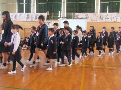 1年生は、6年生に手作りのメダルをかけて一緒に入場したり、全校児童が書いたお手紙を代表して6年生に渡したりしました。