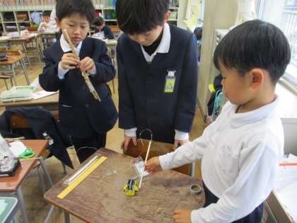理科では、3年生で学習したことを使ったおもちゃづくりに取り組んでます。一人で黙々と作ったり、友達と相談したりしながら製作を進めています。材料の準備等、ありがとうございました。