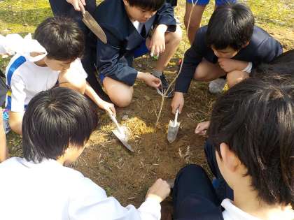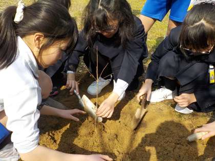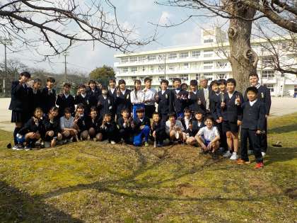 グラウンドの東南角に、卒業プロジェクトの1つ、「卒業記念植樹」として、コナラの苗を2本、植えました。「ろくのいち」と「笑(しょう)」と、名付けました。緑を増やし、後輩たちにどんぐりが成る木を植えたいという願いをもって、植えました。今はまだ、細くて小さい苗ですが、何年か後には、大きく育ち、かわいいドングリの実をつけてくれることを楽しみにしています。