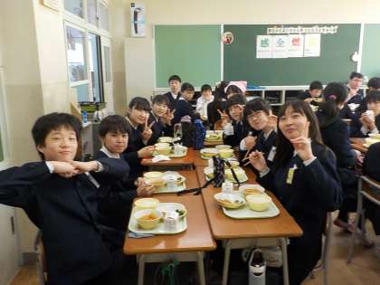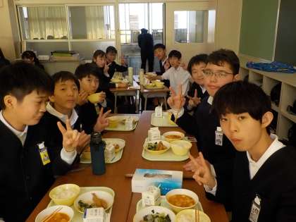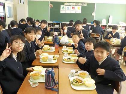 小学校生活最後の給食でした。昔の写真にあったように笑顔で食事をしているところをぱちり。最後まで食器をきれいに拭き、感謝の気持ちを伝えました。