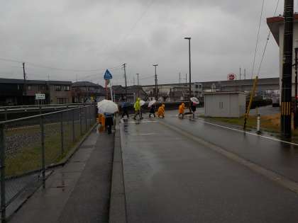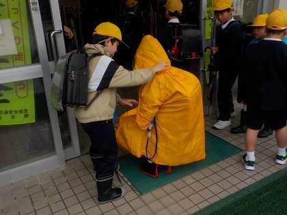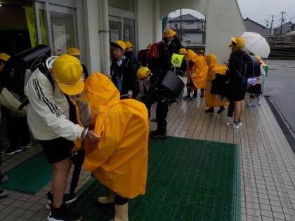 今日は、風雨の強い朝でした。1年生は、カッパを着ての登校でした。学校に着いてから、上級生が1年生に寄り添い、カッパを脱ぐ手伝いをする優しい姿が見られました。